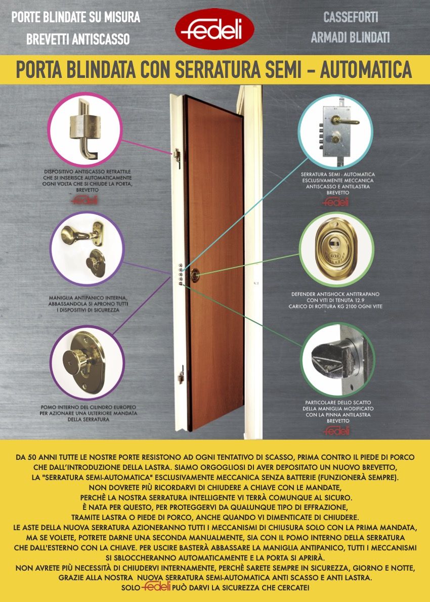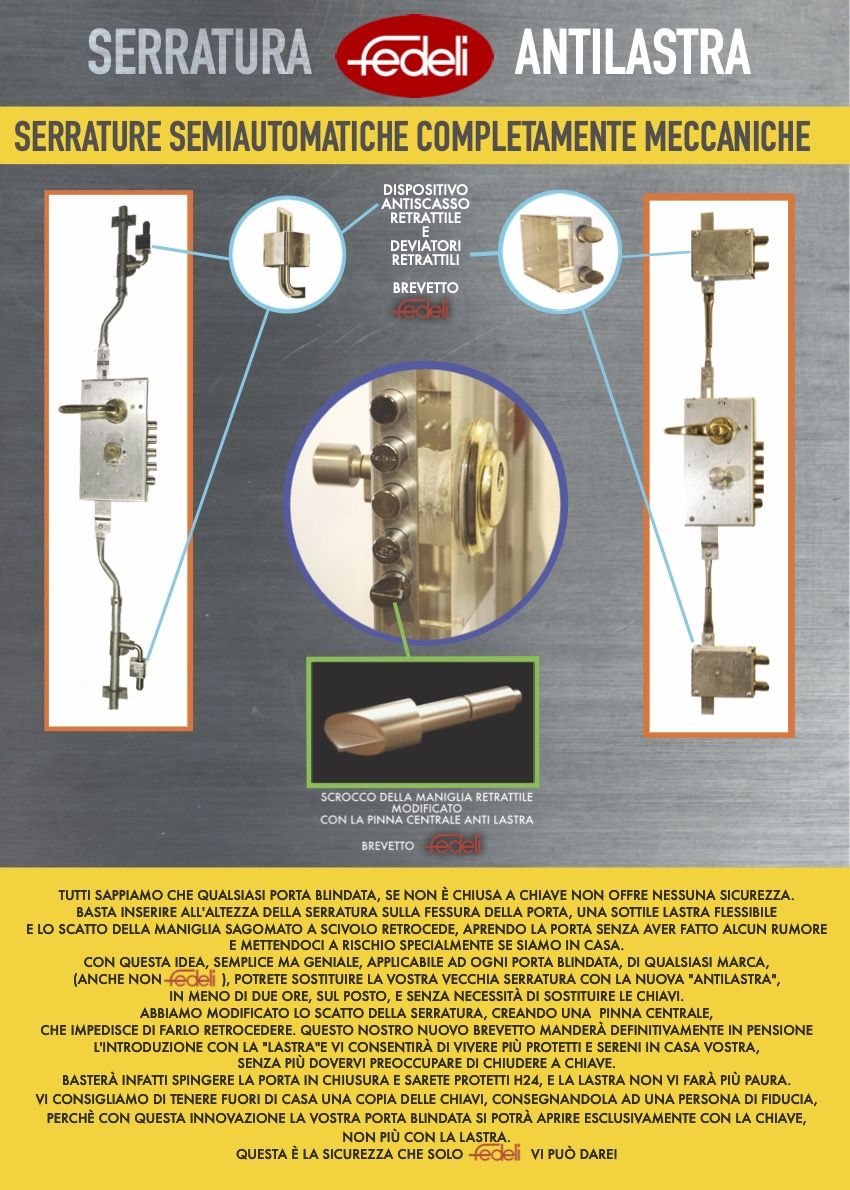 Fedeli ha realizzato un nuovo brevetto, la Serratura Anti-lastra; questa innovazione vi farà stare in sicurezza 24 ore su 24 contro ogni tentativo di apertura con la lastra. Potrete dormire tranquilli perché non vi dovrete più alzare la notte per sbloccare la porta dall’interno per fare entrare un componente della famiglia anche se ha la chiave: la lastra non ci fa più paura!